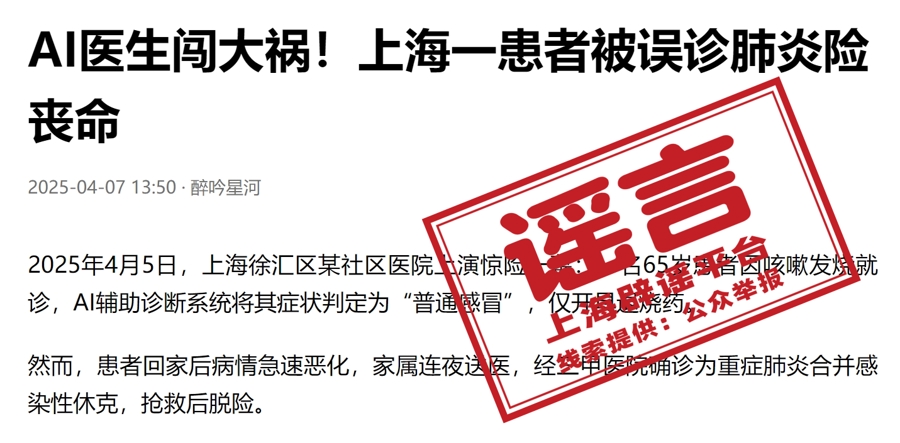 近日,有读者向上海辟谣平台询问,网传“AI医生闯大祸!上海一患者被误诊肺炎险丧命”的消息是不是真的?经核查,近期有不少自媒体以“AI医生”为主角造谣,这条消息正是其中的典型。