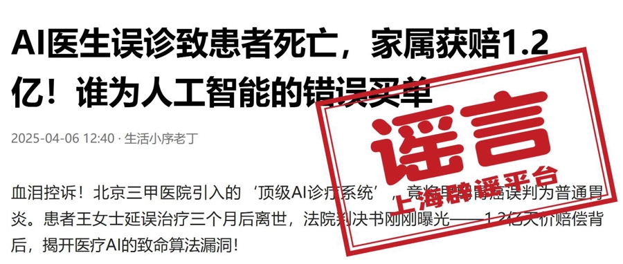 比如,自媒体称“2025年上半年全国AI误诊案例已经达到417起”,还说由权威机构统计;但现在才4月,没到“今年上半年”这一统计节点,权威机构也没有发布过类似的数据。还有自媒体称索赔案例是“全国首例AI诊疗误诊司法判决”,可压根就没有对应的法律文书。