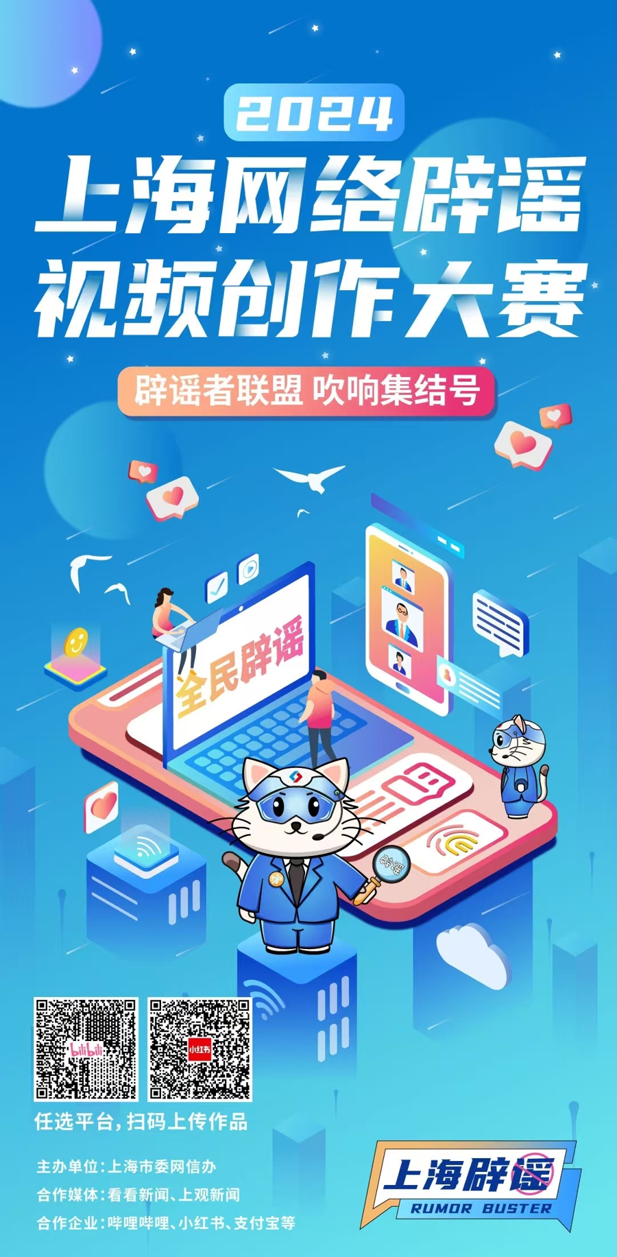 2024年8月6日,上海市委网信办联合上观新闻、看看新闻、部分区委网信办及属地重点网站平台,共同发起首届“上海网络辟谣视频创作大赛”。此次大赛以“辟谣者联盟集结号”为主题,旨在通过辟谣主题视频作品征集,提高网络辟谣参与度,推动上海网络辟谣从“权威发声”走向“全民求证”,擦亮上海特色辟谣品牌。