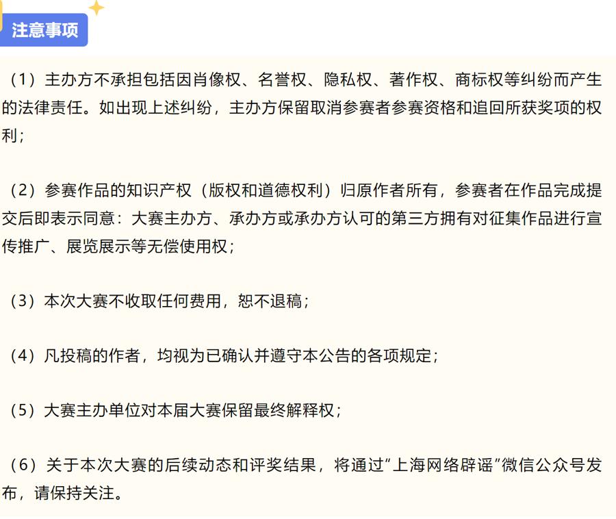 即日起至9月9日,参赛者可通过哔哩哔哩、小红书平台进行投稿,添加活动话题#辟谣者联盟集结号#和#上海网络辟谣#,即可直通参赛。作品时长原则上不超过3分钟,话题包括不限于如《张园人去楼空?真相:没有撤店,实为焕新》等针对某个谣言线索的辟谣澄清;如《喝粥、喝牛奶养胃?很多人中招了!》等围绕生活中常见知识误区的科普;揭示常见谣言套路、普及识谣辨谣技巧;以多样化的形式宣传“不信谣不传谣”的理念等等。