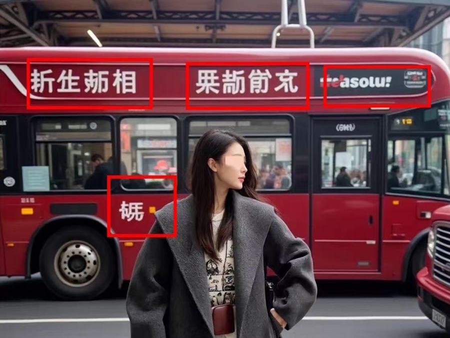 在AI生成的“卖家秀”背景中,出现了很多有违生活常识的细节,包括无法识别的字体、与模特穿着相矛盾的季节特征等等。